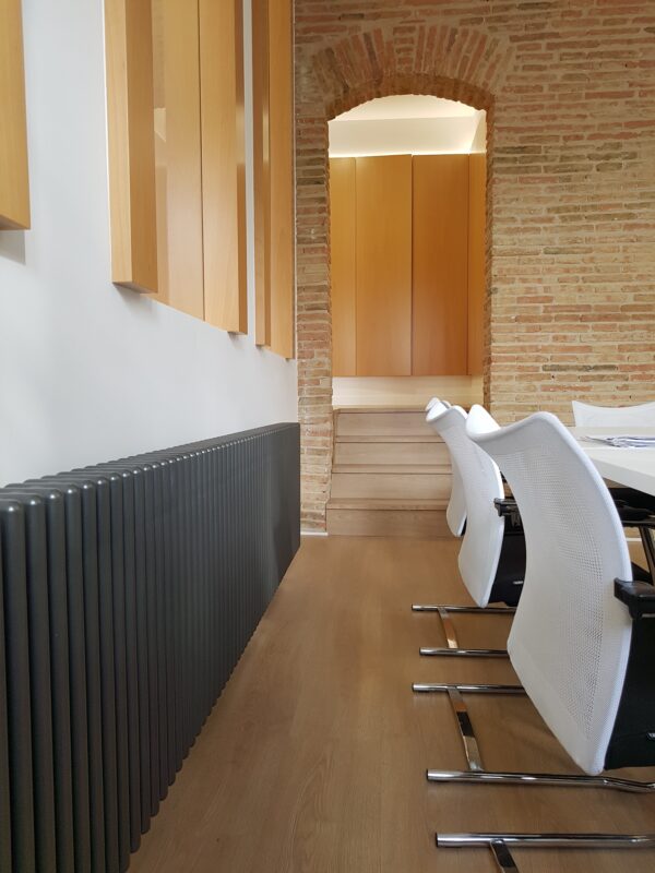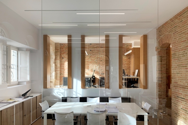 PROYECTO DE ACONDICIONAMIENTO DE LOCAL PARA AGENCIA INMOBILIARIA En pleno centro histórico de la ciudad de Teruel, se encuentra esta agencia inmobiliaria en la que se han unificado dos locales para cubrir las necesidades del cliente. En el espacio diáfano se colocan varios puestos de trabajo, que se conectan visualmente con la otra parte de la oficina mediante tres huecos que se abren en el tabique y donde se accede a través de un antiguo arco en ladrillo que se decide conservar.